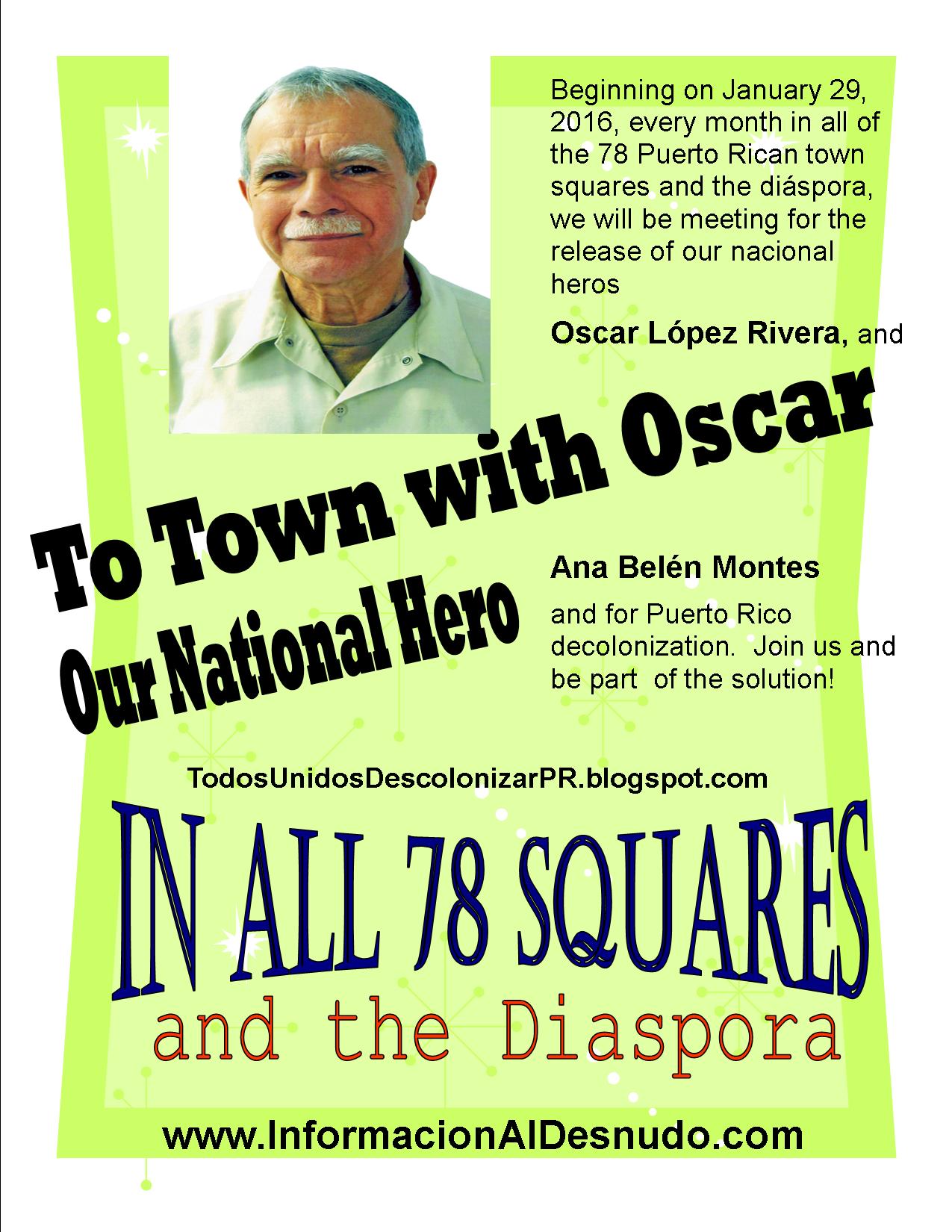 We will gather in the town squares on Friday, January 29, 2016, and every 29th of the month thereafter for the release from prison of our national heroes Oscar López Rivera and Ana Belén Montes until they return home. On the day of their release, we will be at our town squares to give them their well-deserved welcome home!