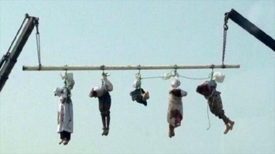 Cuerpos sin vida de presuntos criminales saudíes decapitados colgados de una grúa, junto con sus cabezas.