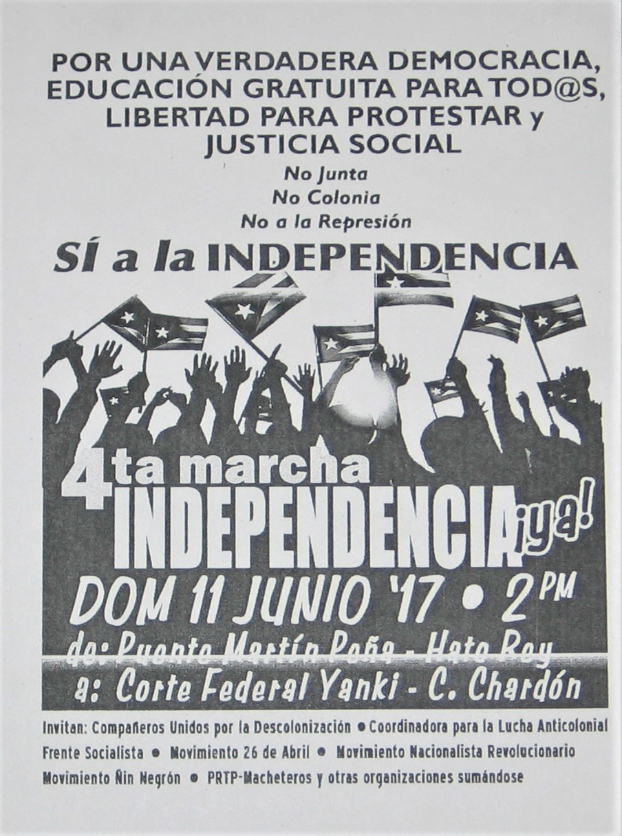 Estamos ya organizando la 5ta Marcha por la independencia de Puerto Rico. Esperemos que esta sea más grande para enviarle un mensaje contundente al mundo que los puertorriqueños queremos que el gobierno de Estados Unidos cumpla con la Carta de la ONU y su 36 resoluciones pidiéndole que nos devuelva inmediatamente nuestra soberanía.