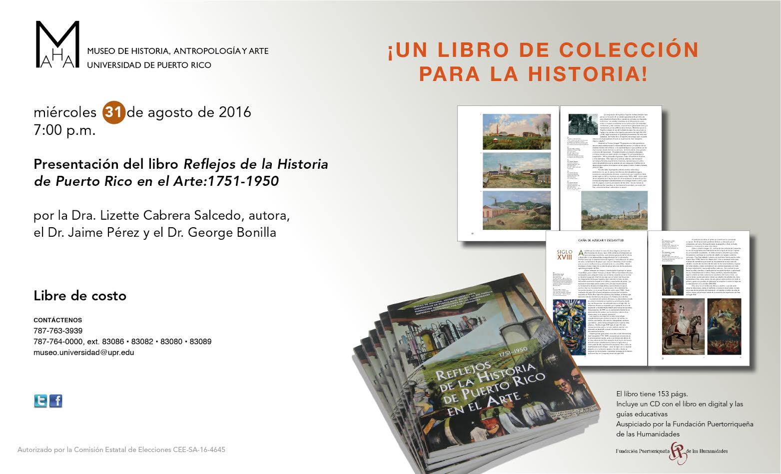 El libro, escrito por la doctora Lizette Cabrera, y auspiciado por la Fundación Puertorriqueña de las Humanidades, acompaña la exposición del mismo nombre, que afirma el interés del Museo en propiciar el estudio de la historia a través del arte. El texto se complementa con las guías educativas que elaboraron los profesores Vivian Méndez, Annette Lebrón y George Bonilla y que serán un excelente recurso para el maestro en el salón de clases.